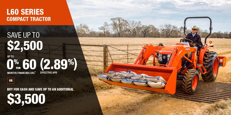 Rebate of $2,500 available on cash purchases of a new L3560/L4060 Rops only. Rebate of $3,500 available on cash purchases of a new L3560/L4060 Cab only. 0% for 60 months financing available only on a new and previously unregistered L3560/4060 Rops or Cab only. 0% for 48 months financing available only on a new and previously unregistered L4760/5460/6060 Rops or Cab only.